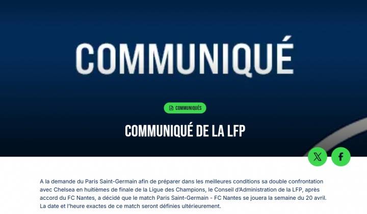 法甲官方给出了比赛延期的原因:确保法国维持在欧洲足联积分榜第五名的位置,从而获得四个欧冠参赛名额。并且,不仅仅是对阵朗斯的比赛会延期,如果大巴黎晋级到半决赛,则考虑将朗斯对阵南特的第33轮比赛提前至5月8日周五进行。联赛为欧冠让路的事情并不少见,但是如此密集的对赛程进行调整,就如同朗斯此前的公告所说:这种对体育公平性的独特解读,在欧洲其他顶级联赛中,几乎难觅同类。